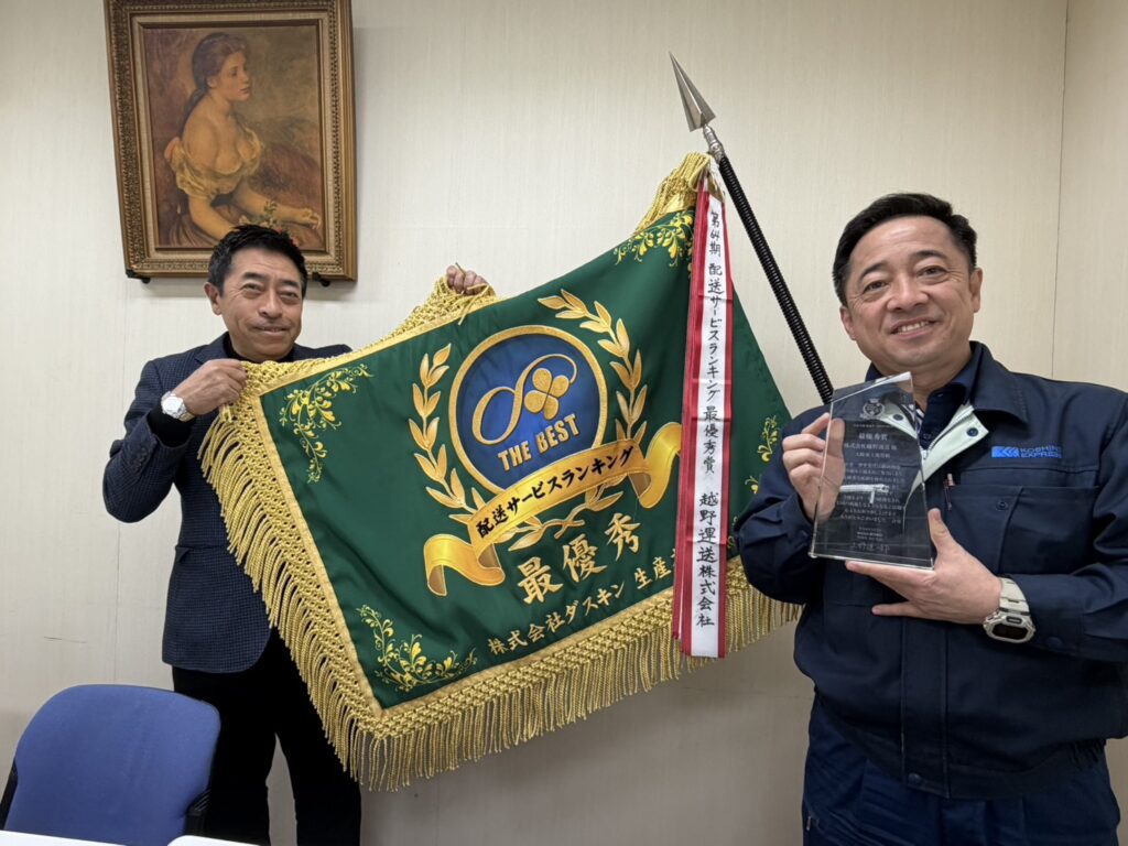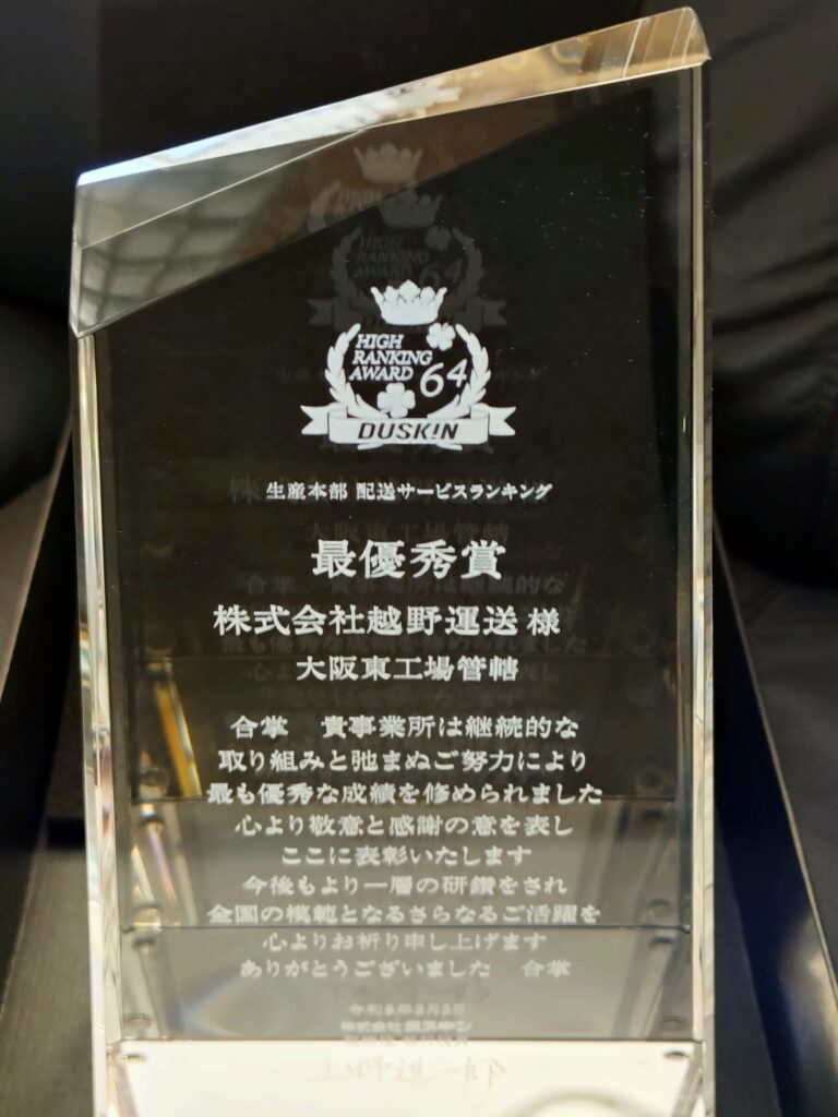 弊社お客様の株式会社ダスキン様より2025年度配送サービスランキング表彰、最優秀賞を頂戴いたしました。